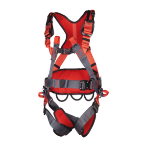 4 pontos de fixação feitos de tecido reforçado: 1 laço têxtil duplo esternal e 1 dorsal para travamento de queda, 2 laterais para posicionamento de trabalho.